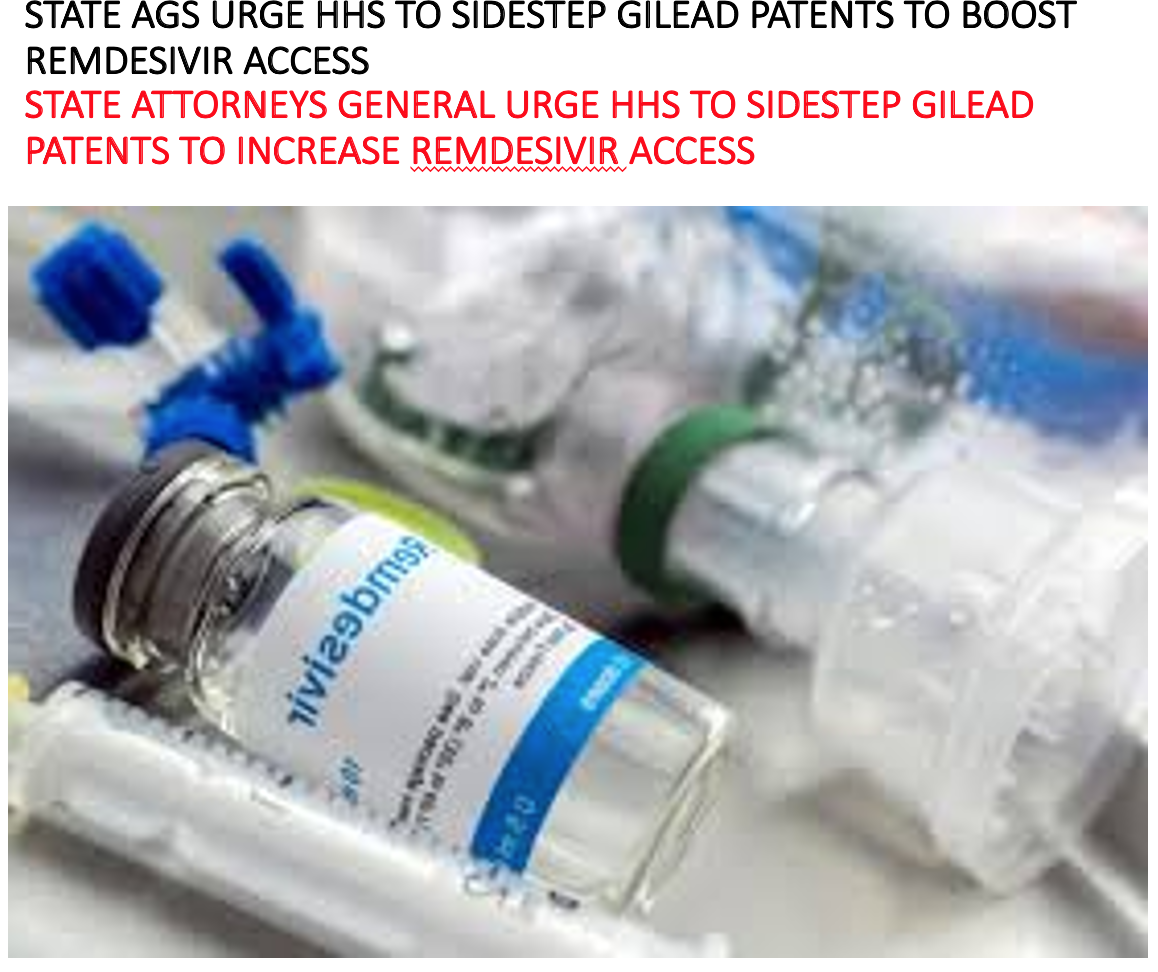 ABD de 30 Demokrat ve Cumhuriyetçi savcı ABD Sağlık Bakanlığı, NIH ve FDA’e bir mektup yazarak Remdesevirin fiyatının düşürülmesi ve üretimin artırılması için federal patent kanunun yürürlüğe sokulmasını istediler (http://agjefflandry.com/Article/10770)