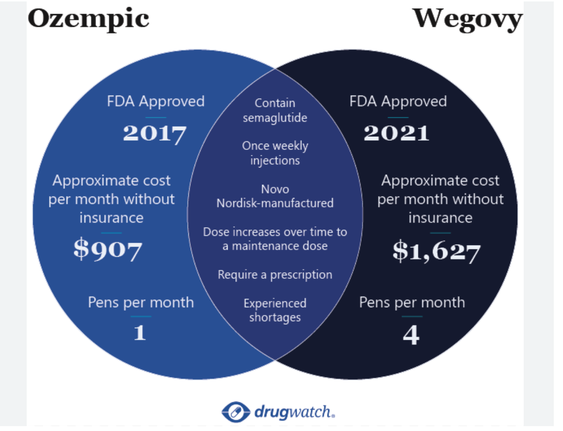 Ozempic (semaglutid) Novo Nordisk tarafından geliştirilen ve yalnız tip 2 diyabet tedavisi için piyasaya çıkartılmış, 2017 de FDA den bu amaçla onay almış bir ilaçtır. Wegovy (semaglutid) ise komik bir şekilde ayni etken maddeyi ihtiva eden fakat ‘’ Yerleşik kardiyovasküler hastalığı olan ve obezite veya aşırı kilolu yetişkinlerde majör advers kardiyovasküler olay (kardiyovasküler ölüm, ölümcül olmayan miyokard enfarktüsü veya ölümcül olmayan inme) riskini azaltmak,ve aşırı vücut ağırlığını azaltmak ve uzun vadede kilo vermeyi sürdürmek için’’ 2021 yılında ruhsat almış bir ilaçtır.