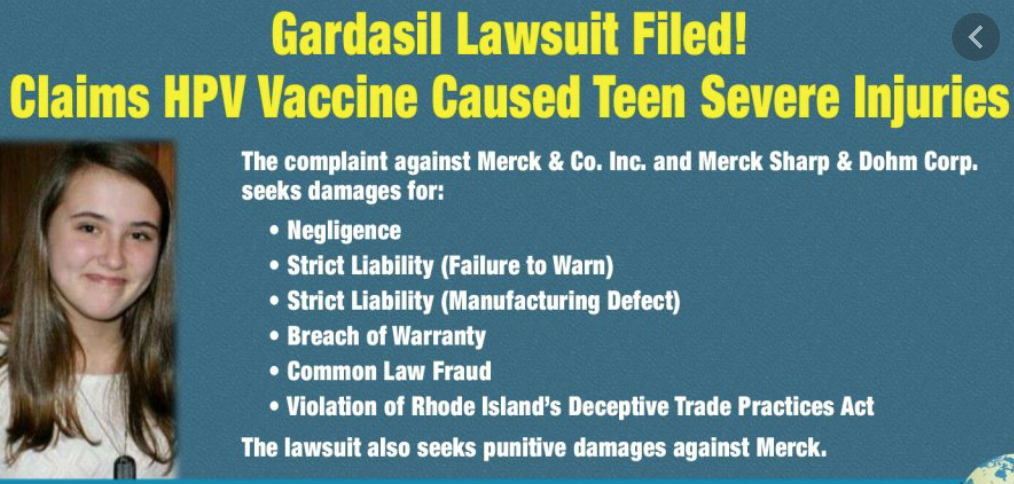 Birkaç ay önce Baum Hedlund Aristei ve Goldman hukuk firması tarafından GARDASİL’in üreticisi MSD aleyhine 19 yaşındaki bir kız için dava açtı. Davacı, aşının emniyeti ve etkenliği yönünden MSD nin FDA, doktorlar, bürokratlar ve anneleri yanılttığını iddia etti. MSD nin bilinçli olarak aşının içerdiği maddeleri gizlemeye çalıştığı, aşının bir nörotoksin olan alüminyum ve tehlikeli DNA partikülleri ihtiva ettiği ileri sürüldü. Davacı Julia Balasco, insan papillomavirüs (HPV) Gardasil aşısının birden fazla enjeksiyonu yapıldıktan sonra postural ortostatik taşikardi sendromu (POTS) olarak bilinen otoimmün bir hastalık gibi ciddi ve kalıcı fiziksel bozukluklar yaşadığını ve acı çekmeye devam ettiğini iddia ediyor.