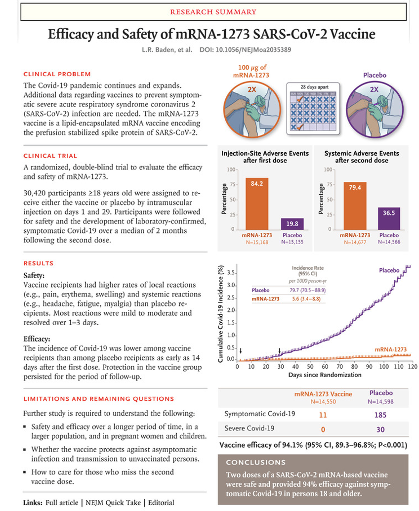 Semptomatik Covid-19 hastalığı, plasebo grubundaki 185 katılımcıda (1000 kişi-yılı başına 56,5;% 95 güven aralığı [CI], 48,7 ila 65,3) ve mRNA-1273 grubundaki 11 katılımcıda (1000 kişide 3,3- yıl;% 95 GA, 1,7 - 6,0) tesbit edildi. Aşı etkinliği% 94.1 (% 95 CI,% 89.3 ila% 96.8; P <0.001) bulundu.  65 yaş ve üstü katılımcılarda analizler: Plasebo grubunda 30 katılımcıda birisi ölümle sonuçlanan şiddetli Covid-19 meydana geldi. Aşılamadan sonra orta, geçici reaktojenite mRNA-1273 grubunda daha sık meydana geldi. Ciddi yan etkiler nadirdi ve insidans iki grupta benzerdi.