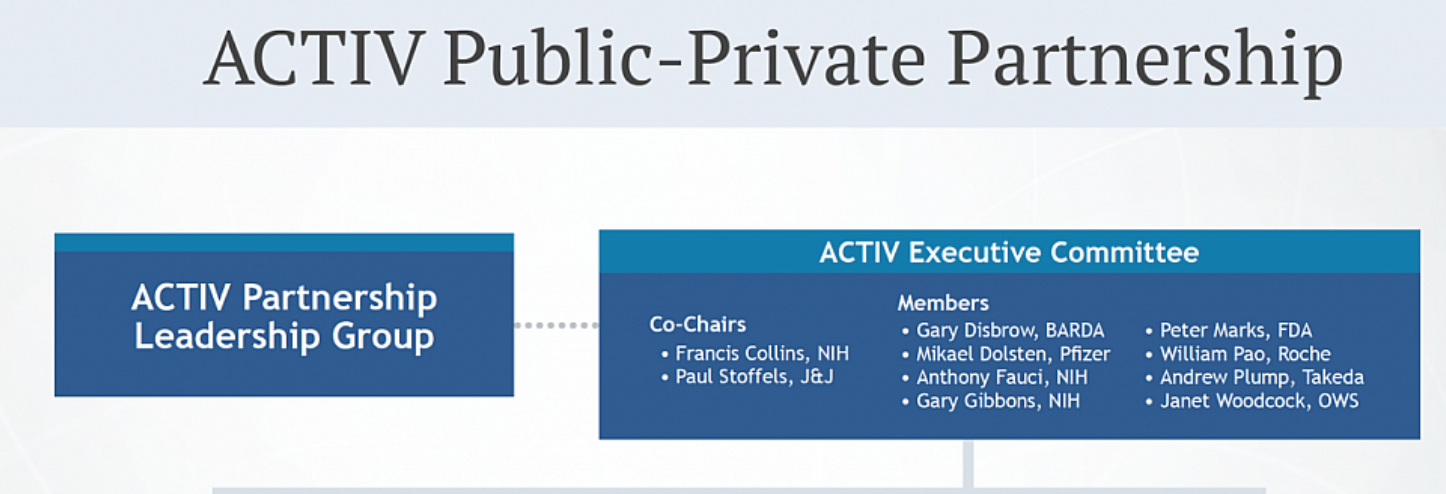 Eşi görülmemiş bir zaman diliminde çalışan ACTIV kamu-özel ortaklığı, COVID-19 için potansiyel uygulama ile yüzlerce mevcut terapötik ajanı değerlendirdi, en umut verici adaylara öncelik verdi, ACTIV klinik denemeleri için beş uyarlanabilir ana protokol tasarladı ve uyumlu hale getirdi ve çok sayıda NIH- öncelikli terapötik adayları test etmek için bu klinik denemeleri başlatmak için desteklenen ağlar.